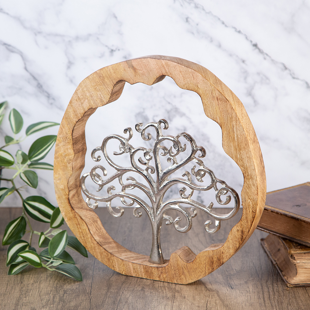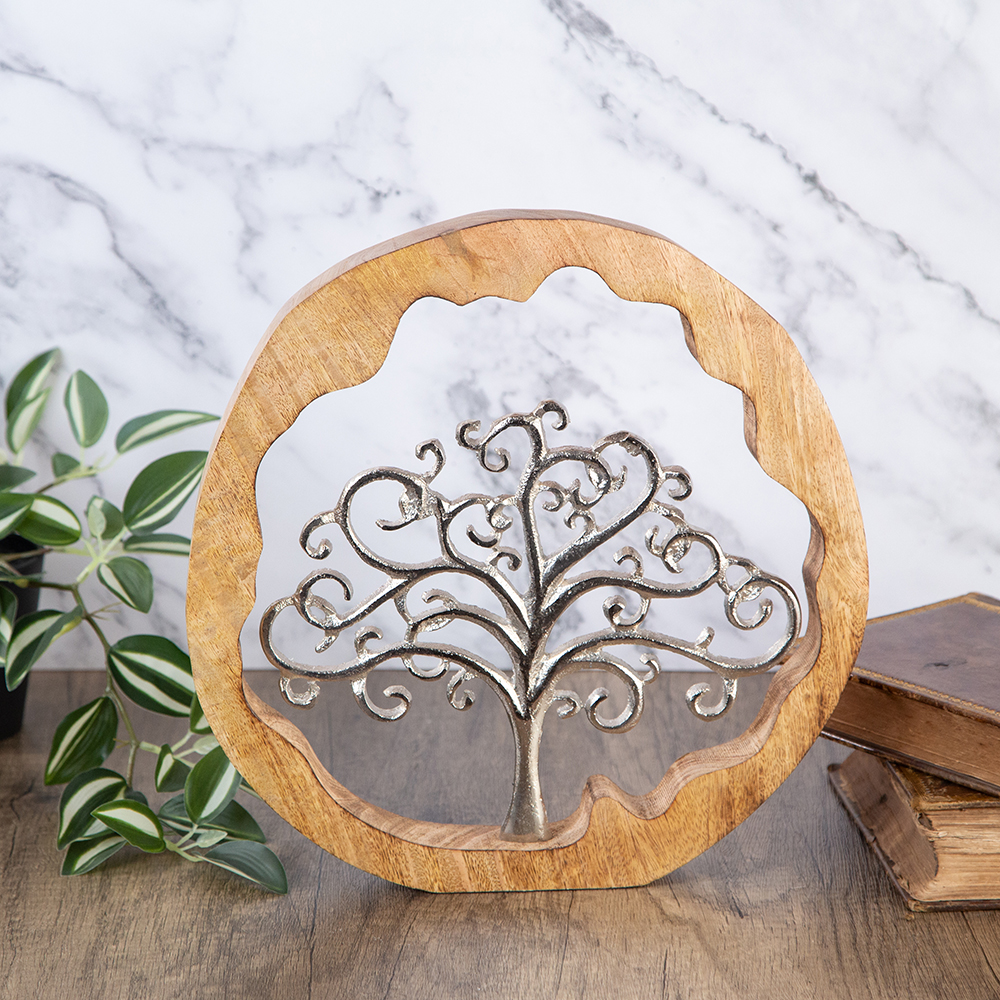 mounted on a wooden circle. It symbolizes the connection between all living