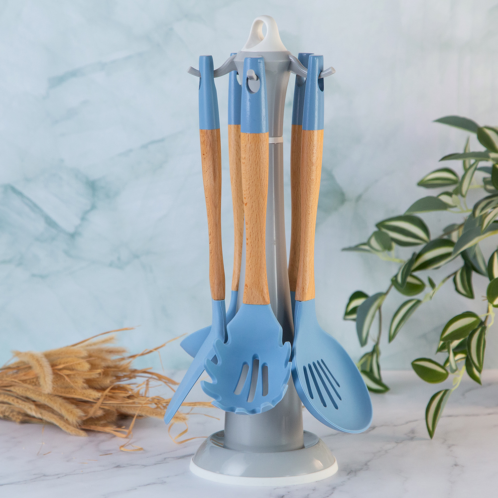 The cookware set with stand is a practical and stylish way to organize kitchen accessories that fits into any kitchen interior.
