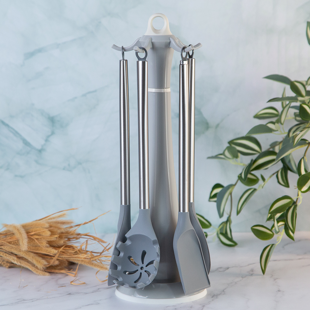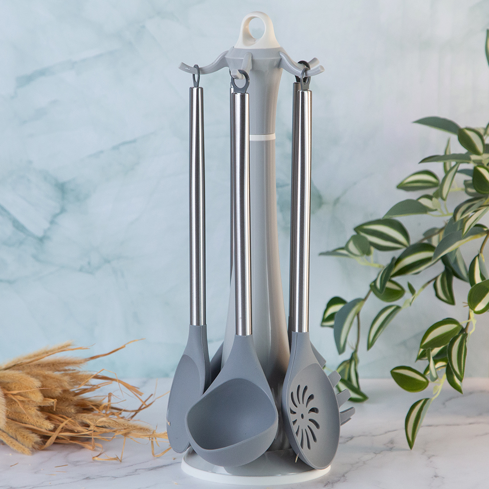 The cookware set with stand is a practical and stylish way to organize kitchen accessories that fits into any kitchen interior.