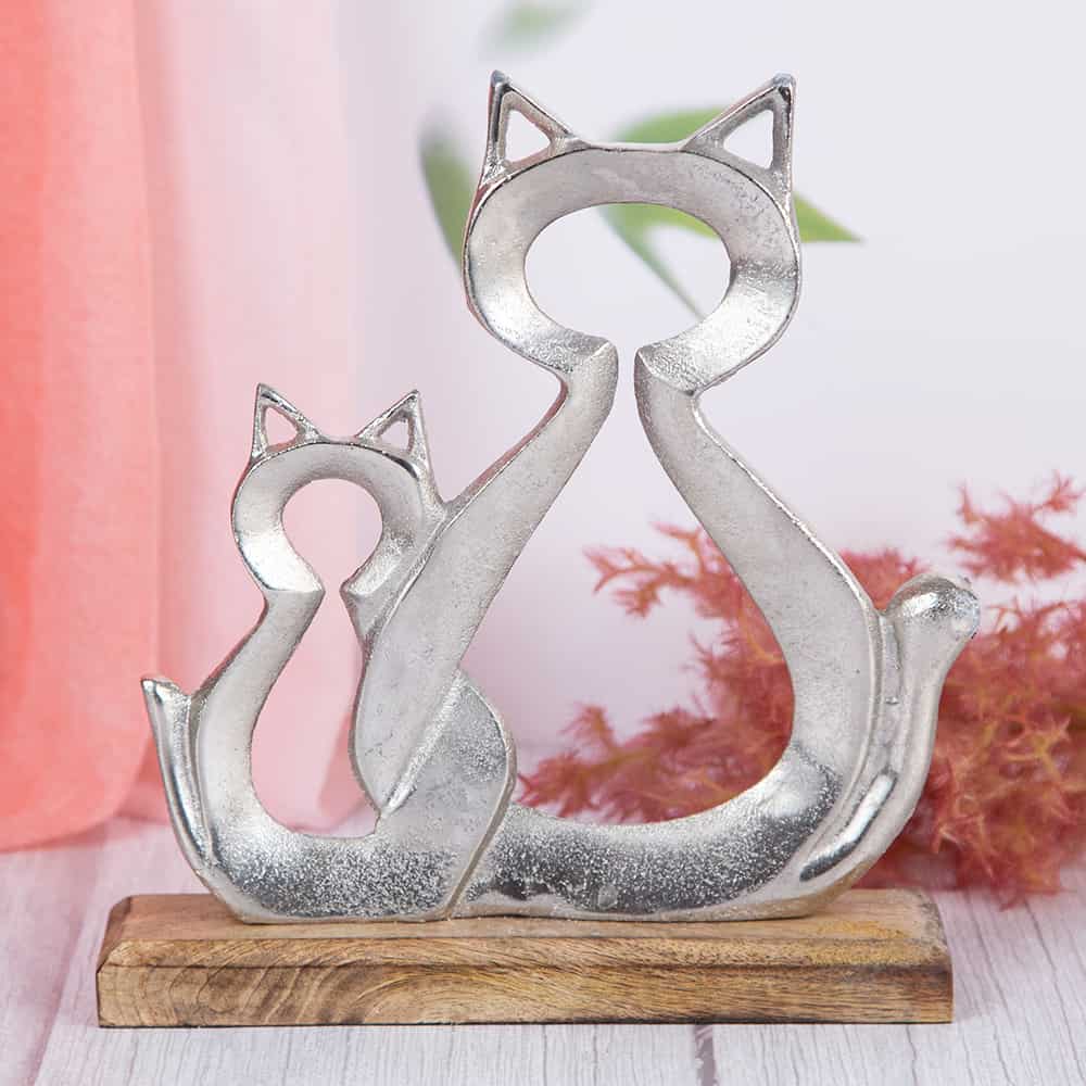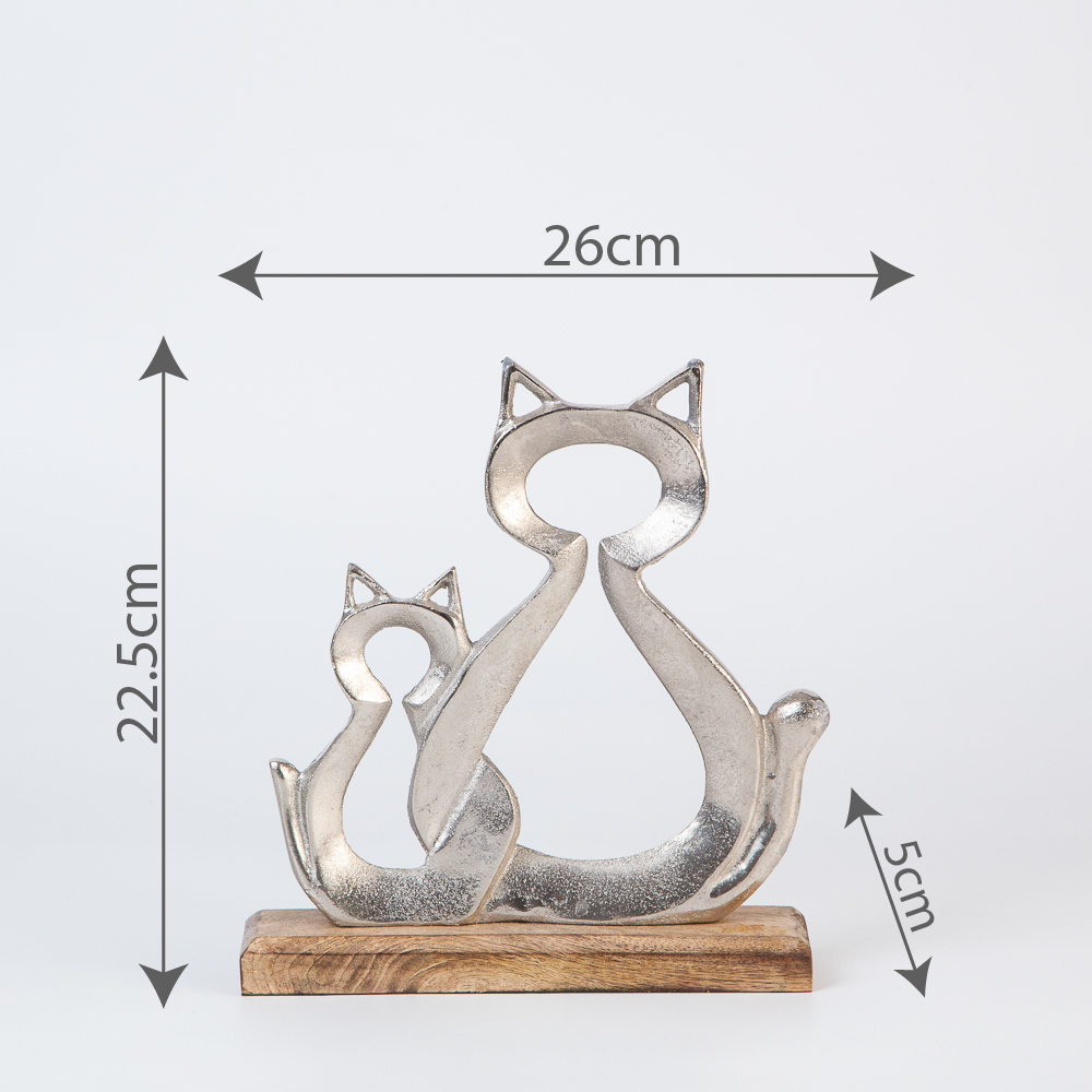 "Graceful Cats" Decorative Figure: "Graceful Cats" showcases elegantly intertwined silhouettes of two cats crafted from aluminum. The combination of metal's brilliance and the warmth of solid mango wood creates a symbol of love, unity, and mutual understanding between two hearts. This figure evokes the emotion of closeness and the strong connection between lovers or close individuals.