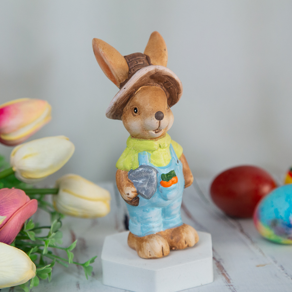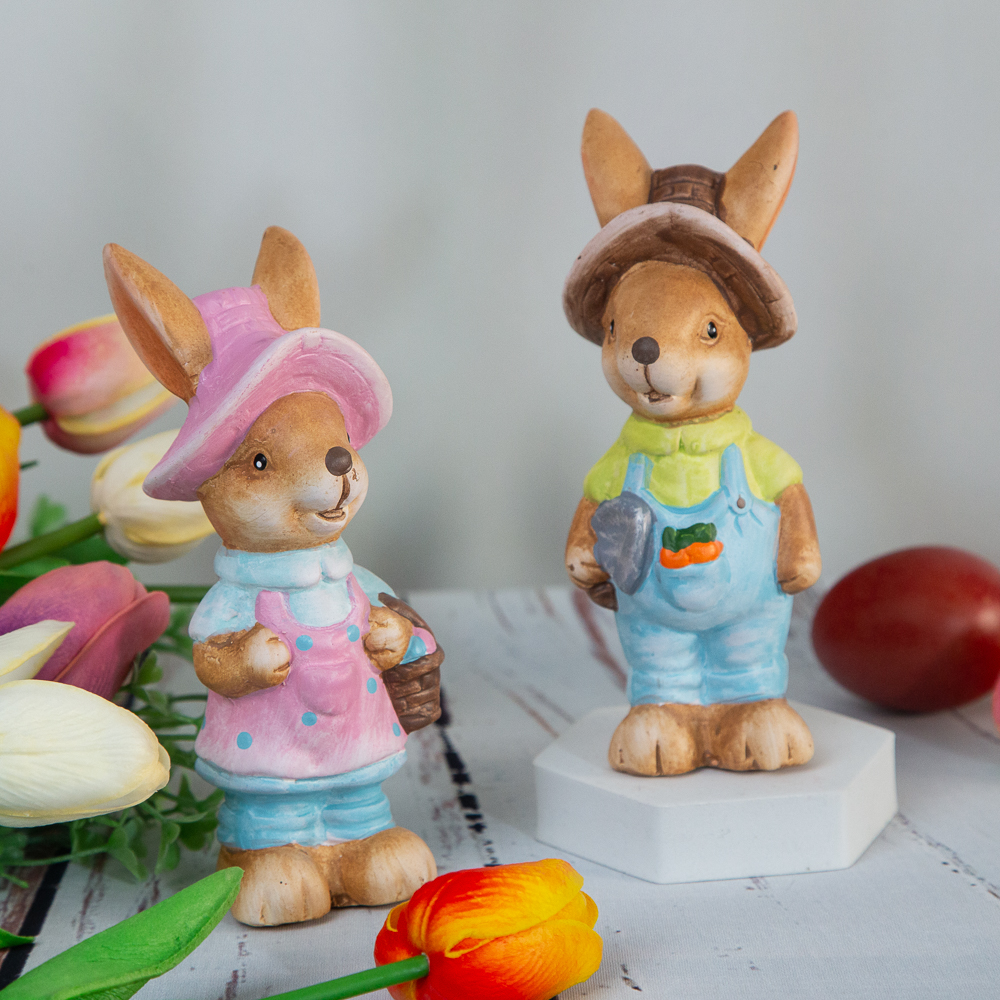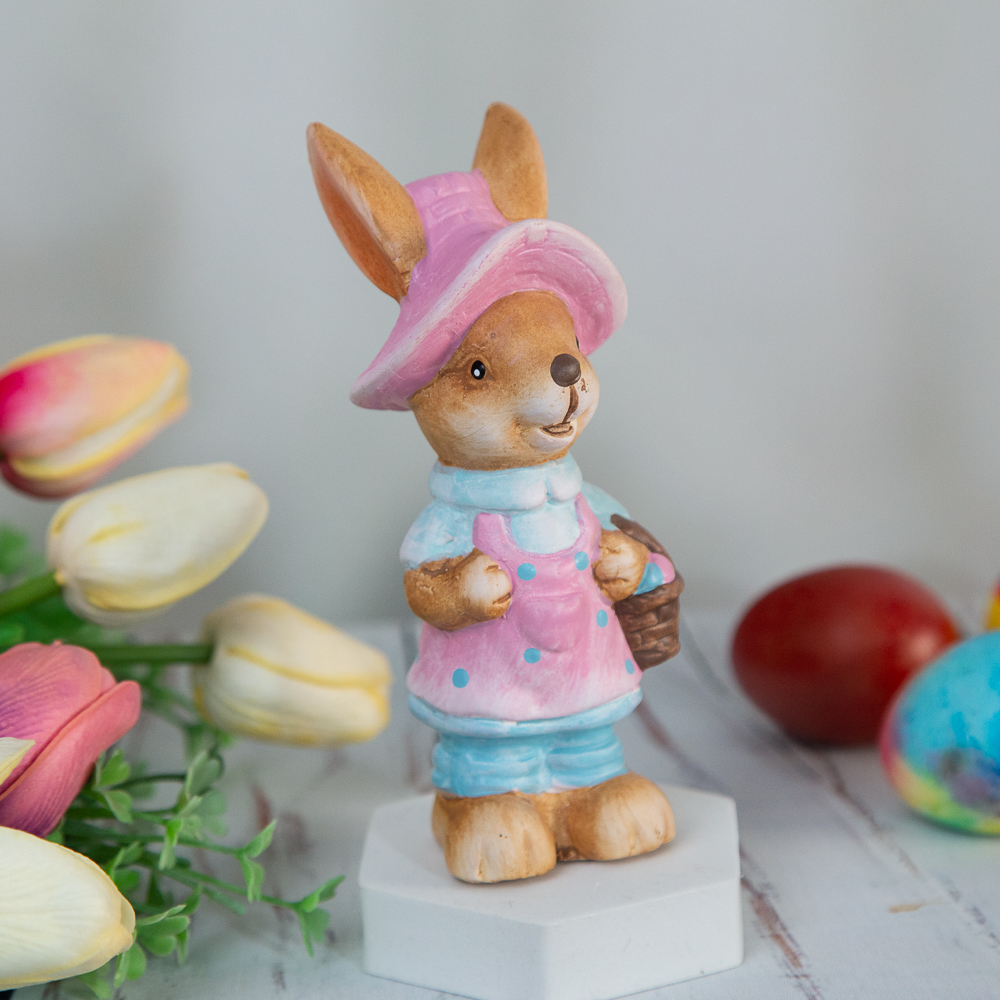 The charming rabbit figurine with basket is an Easter-themed decoration and adds a touch of joy and comfort to any home.