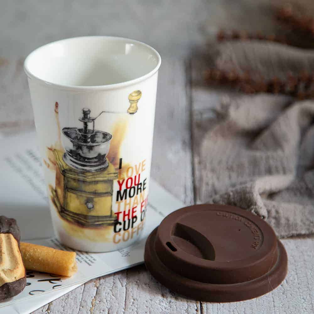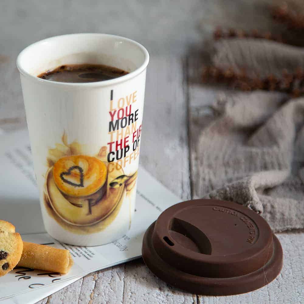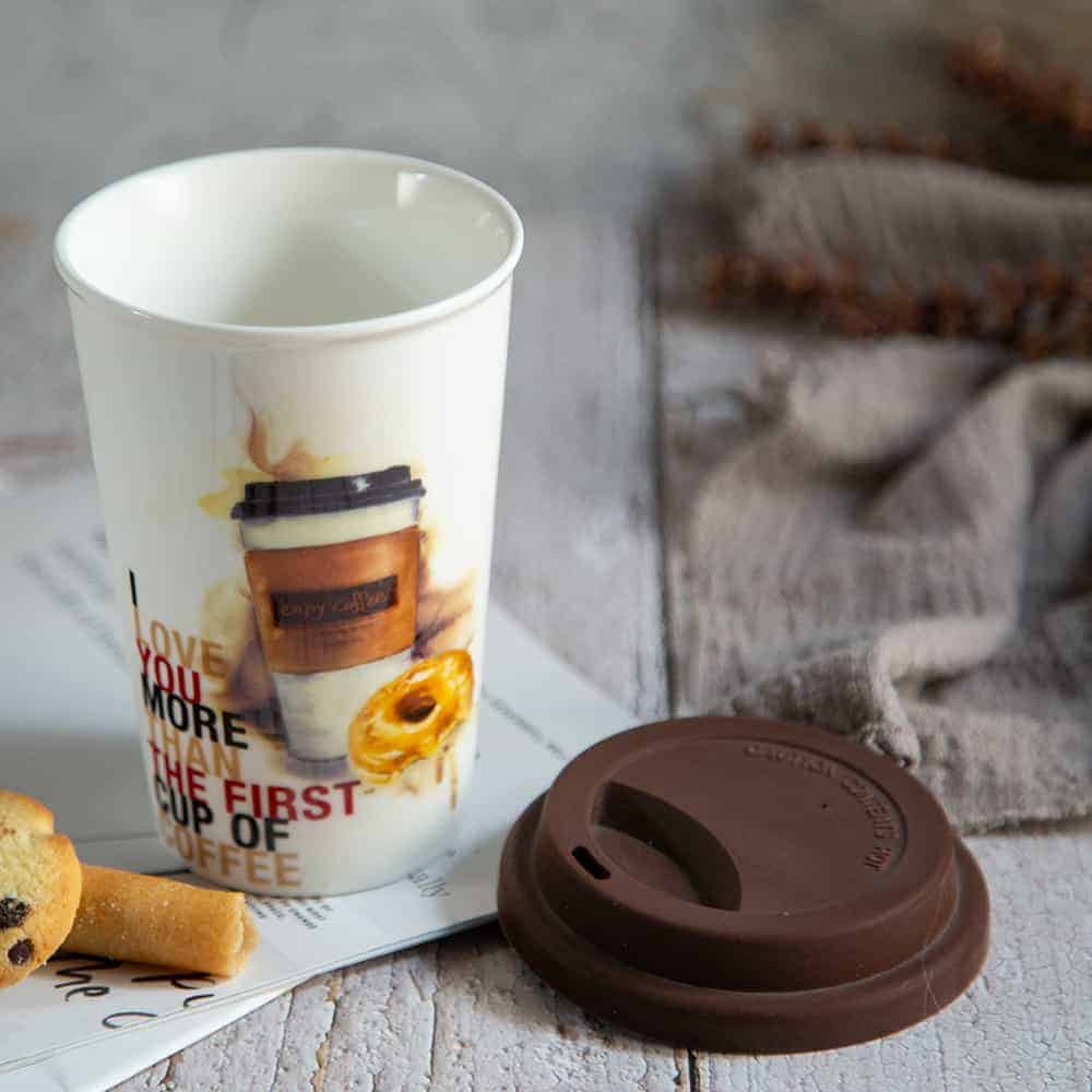 The "I love you more than the first cup of coffee" Travel Mug with Silicone Lid is available in four different designs and comes in a coloured gift box. Please indicate your choice when ordering.