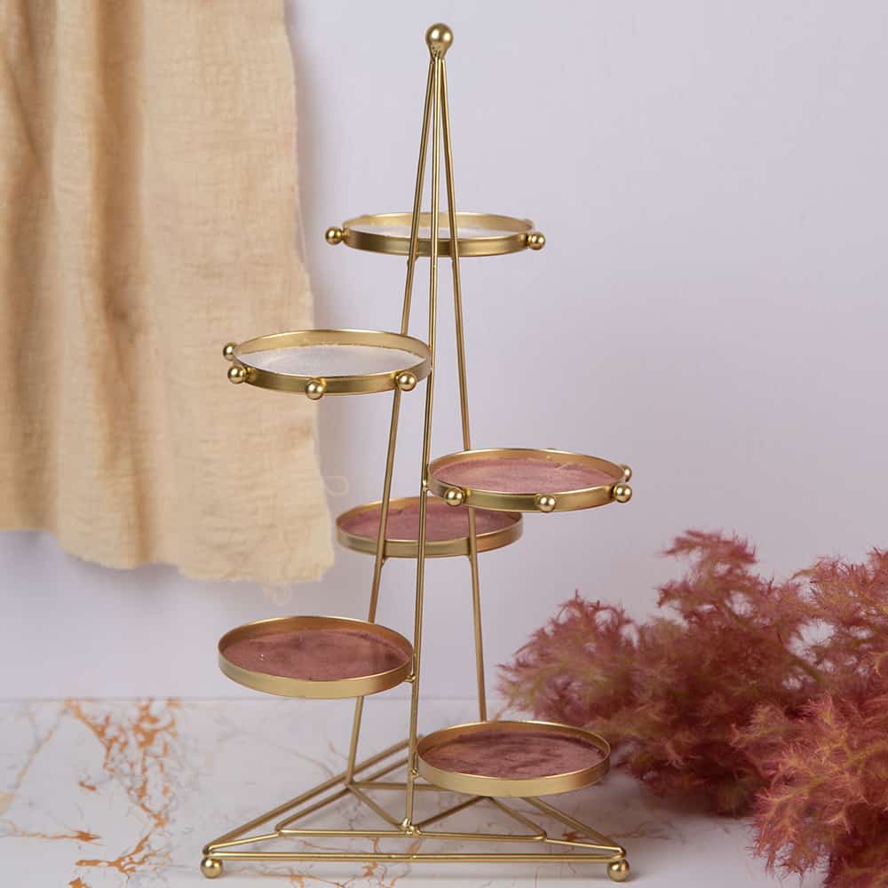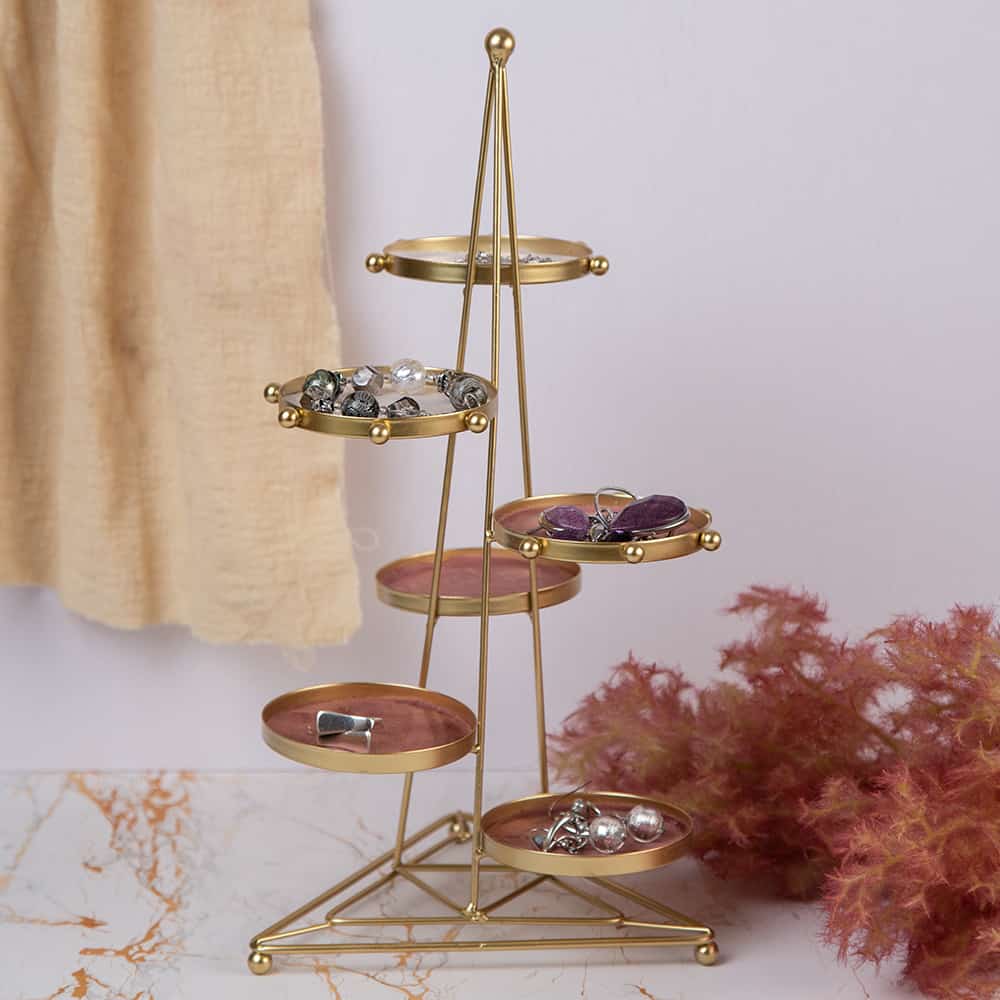 The metal pyramid-shaped jewelry stands with six compartments is an elegant solution for storing jewelry. Compact and graceful, it offers convenient organization for bracelets, necklaces, rings, and other accessories. The stand provides easy access to each compartment, making it effortless to find the desired jewelry piece. Combining style and functionality, this metal stand will add an aesthetic accent to your dresser, vanity, or makeup table. An ideal gift for jewelry enthusiasts and those who appreciate elegant accessories.