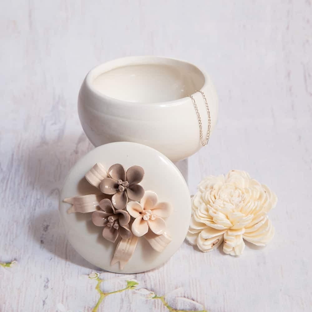 The jewelry box with an arranged lid of handmade flowers.