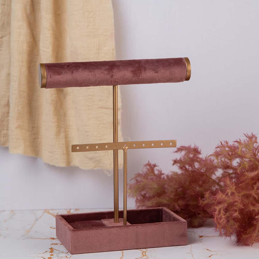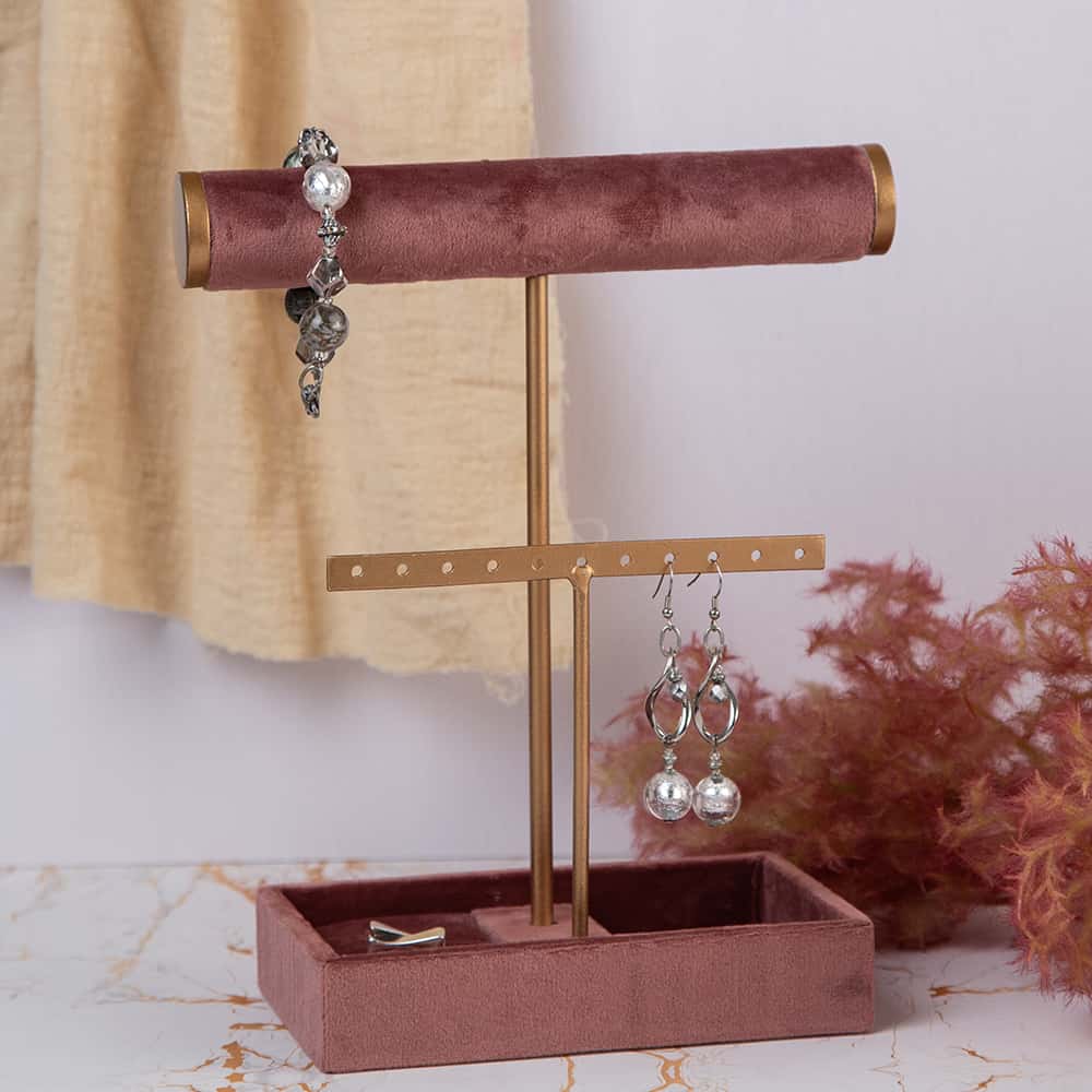 The metal jewelry stand with two tiers is elegant and practical. Adorned with delicate plush on the interior, it protects the jewelry from scratches. It features a special compartment for rings at its base, keeping them organized and neatly arranged. This stylish stand provides a convenient and elegant way to store necklaces, bracelets, and earrings. Suitable for home or office use, it adds aesthetics and functionality to your space. An ideal gift for any woman who loves to have her jewelry organized and always at hand.