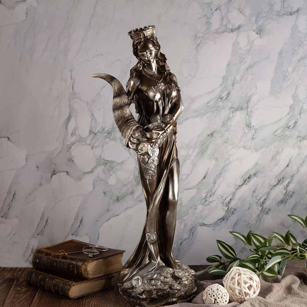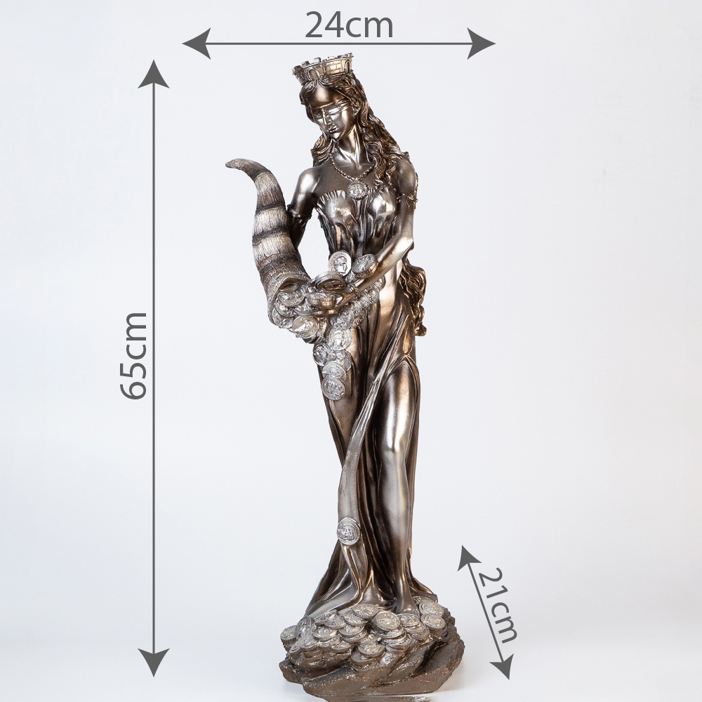 Large decorative figurine Fortune. The goddess of abundance, fertility, happiness and luck. She is depicted with the horns of plenty while stepping on coins. Stylish gift for a boss or business partner, and an exquisite addition for the office and home.