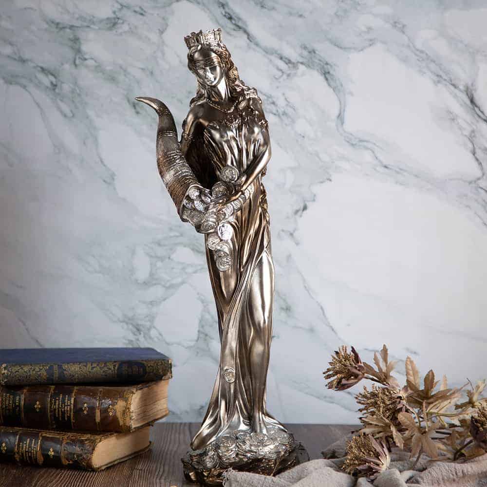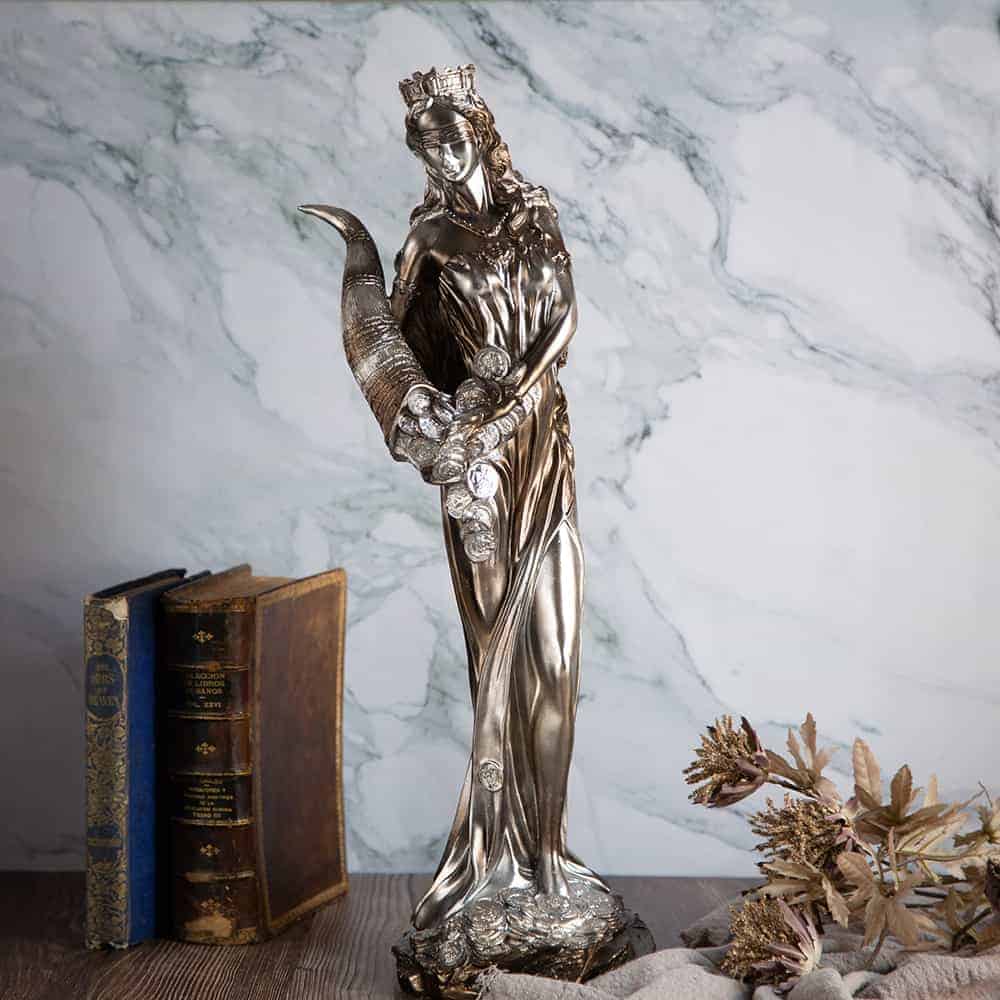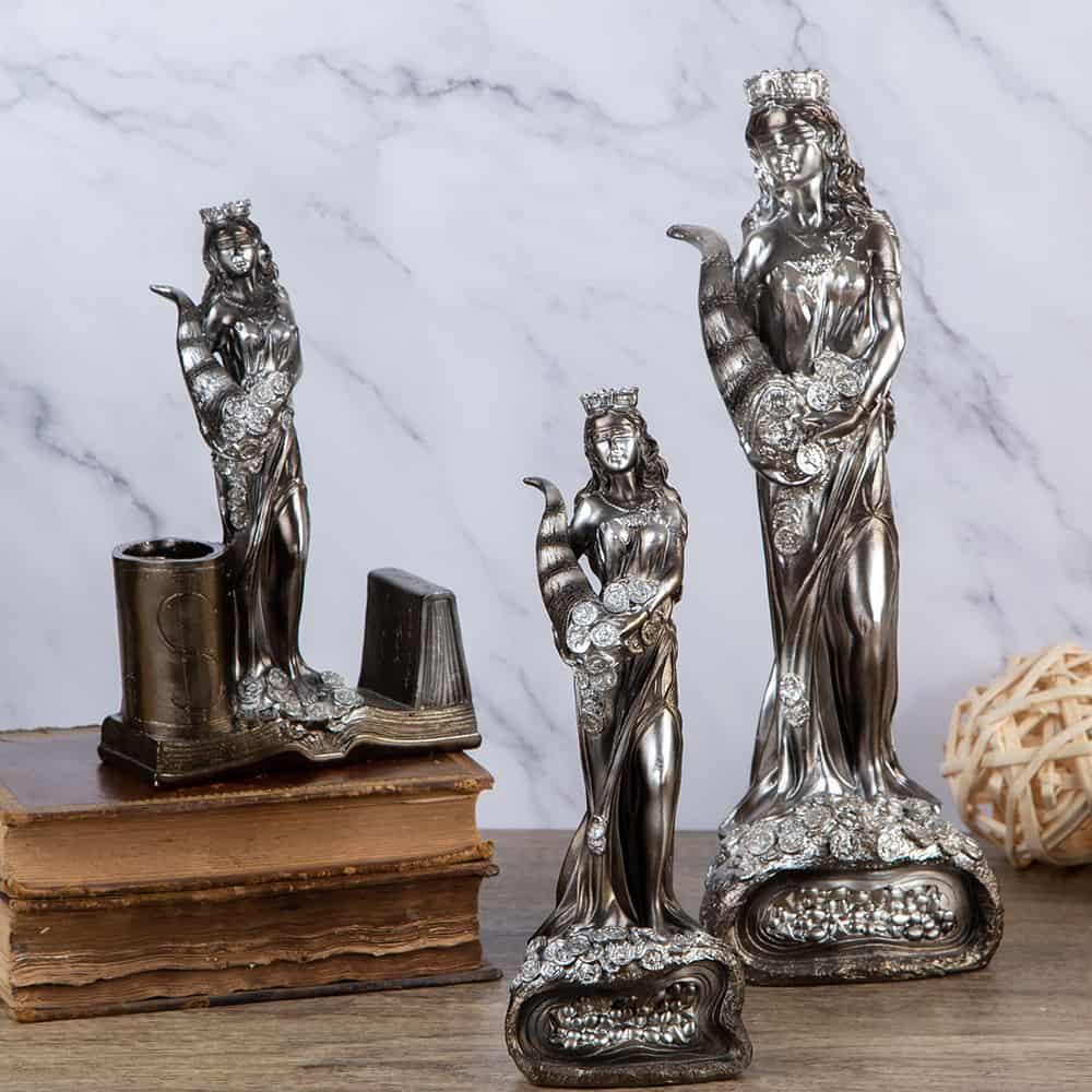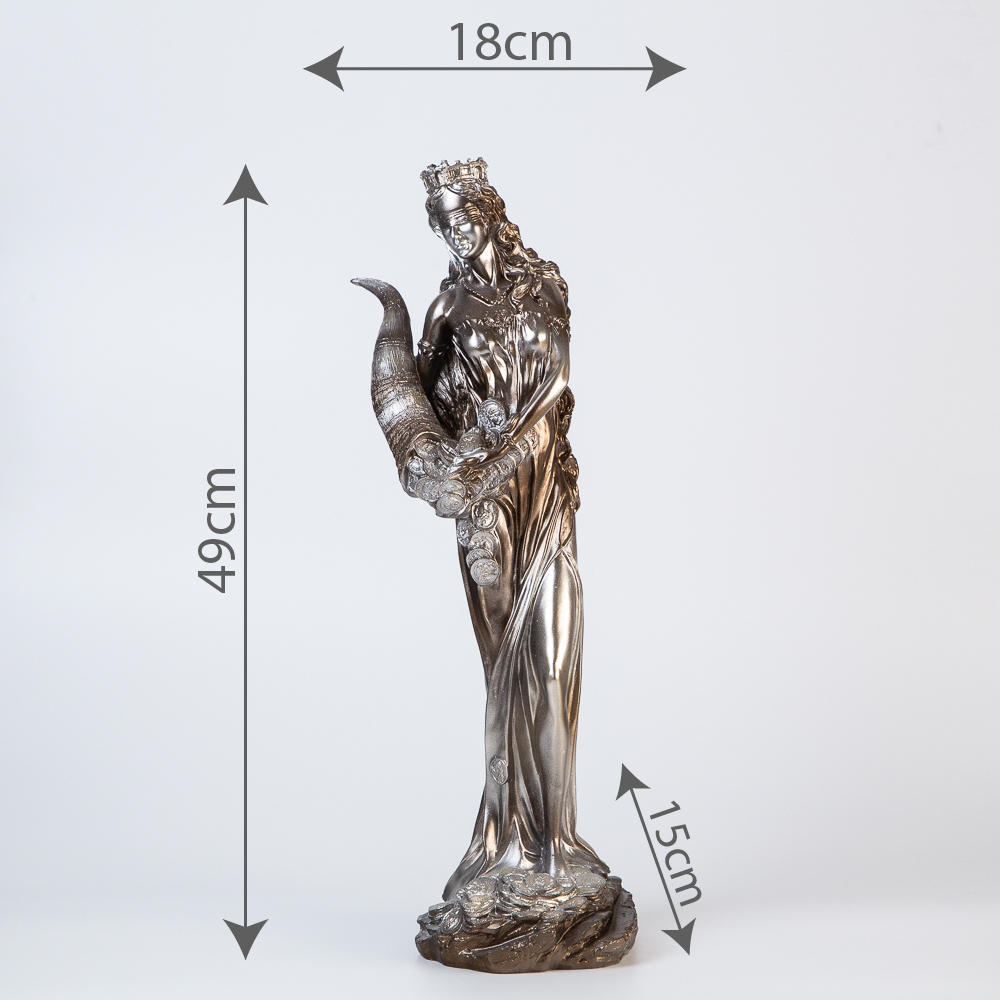 Medium decorative figurine Fortune. The goddess of abundance, fertility, happiness and luck. She is depicted with the horns of plenty while stepping on coins. Stylish gift for a boss or business partner, and an exquisite addition for the office and home.